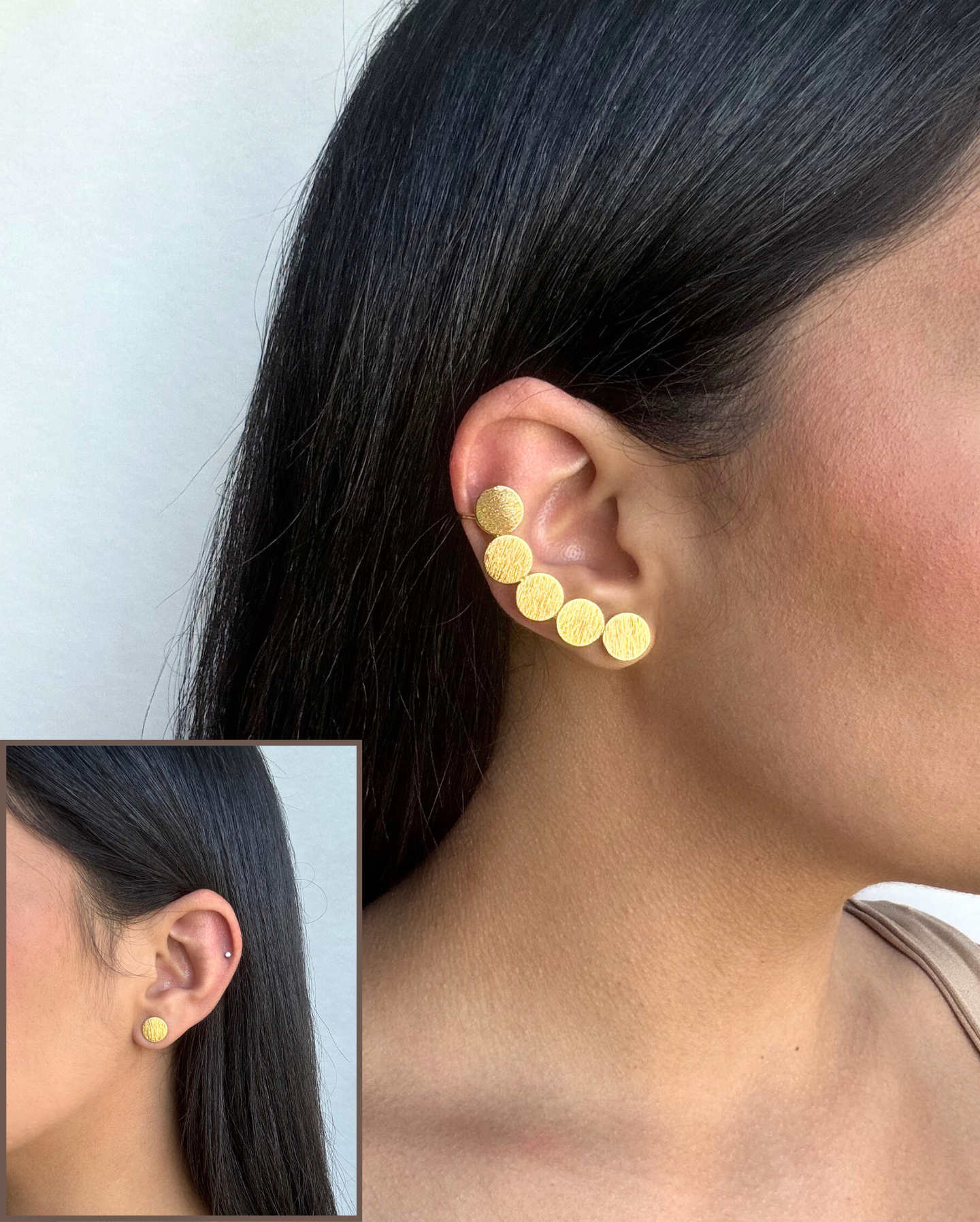 Pantallas pegadas con diseño de círculos lisos. En un lado va la pantalla que luego de ponerla como normalmente se usa, acomodas en la parte de arriba con un gancho ajustable para que quede pegado en el borde de la oreja. En el otro lado iría la pantalla sencilla.