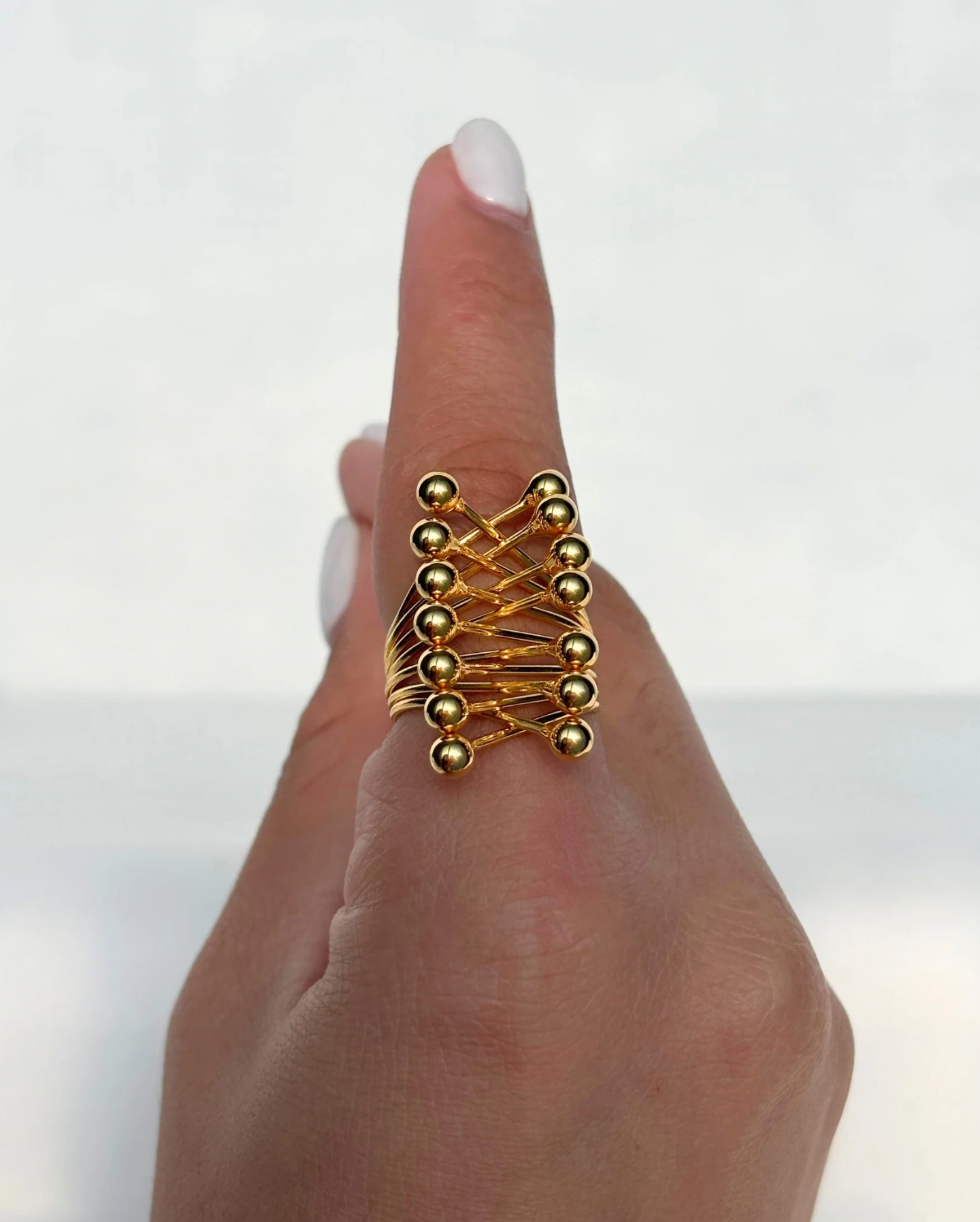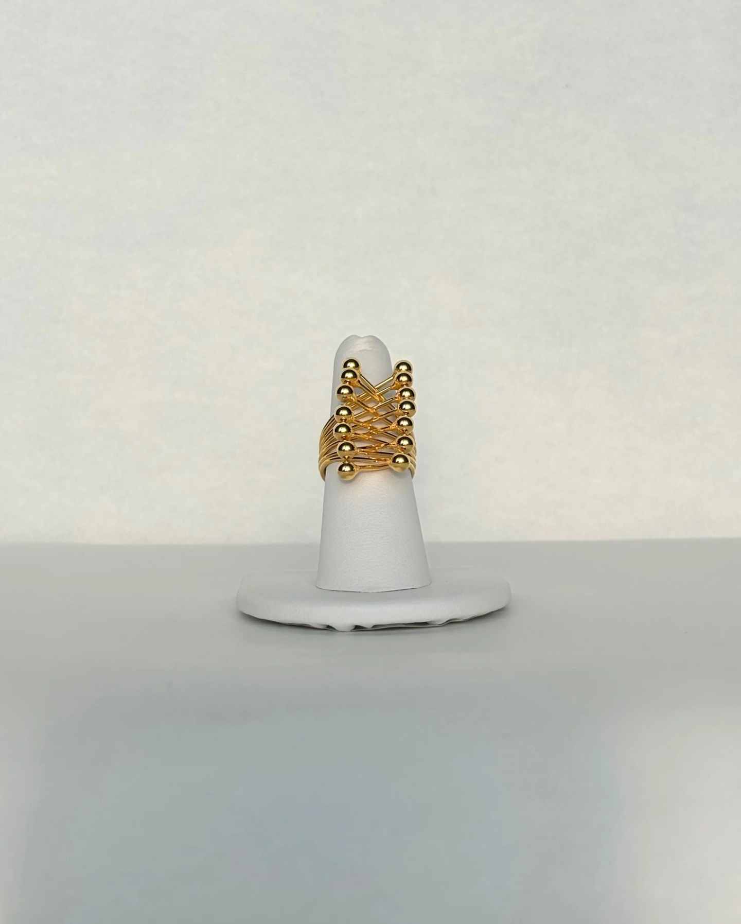 Anillo con diseño de lineas entrelazadas y terminadas con un balin, ajustable y versátiles para toda ocasión